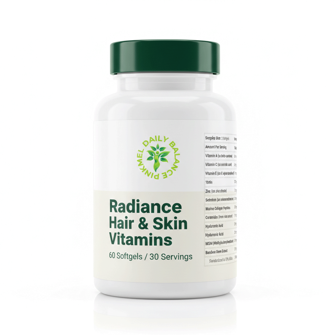 Radiance Hair & Skin Vitamins deliver a potent, bioavailable blend of nutrients designed to nourish beauty from within. This targeted formula may help support healthy hair growth and scalp vitality, might promote collagen production for firmer, more radiant skin, and may strengthen brittle nails. With biotin, vitamins A, C, and E, plus marine collagen and ceramides, this daily beauty complex might also protect against environmental stressors and support a youthful, glowing appearance.